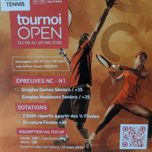 Un nouveau tournoi Open est programmé au mois de mai. En effet en simple dames séniors, simple messieurs séniors ou en + 35, de non classés à N1 , les participants s’affronteront du 08 au 29 mai au complexe Francis Lafuente de Cenon avec de belles récompenses promises. Les inscriptions se font via l’application tenup à partir du 27 mars.
