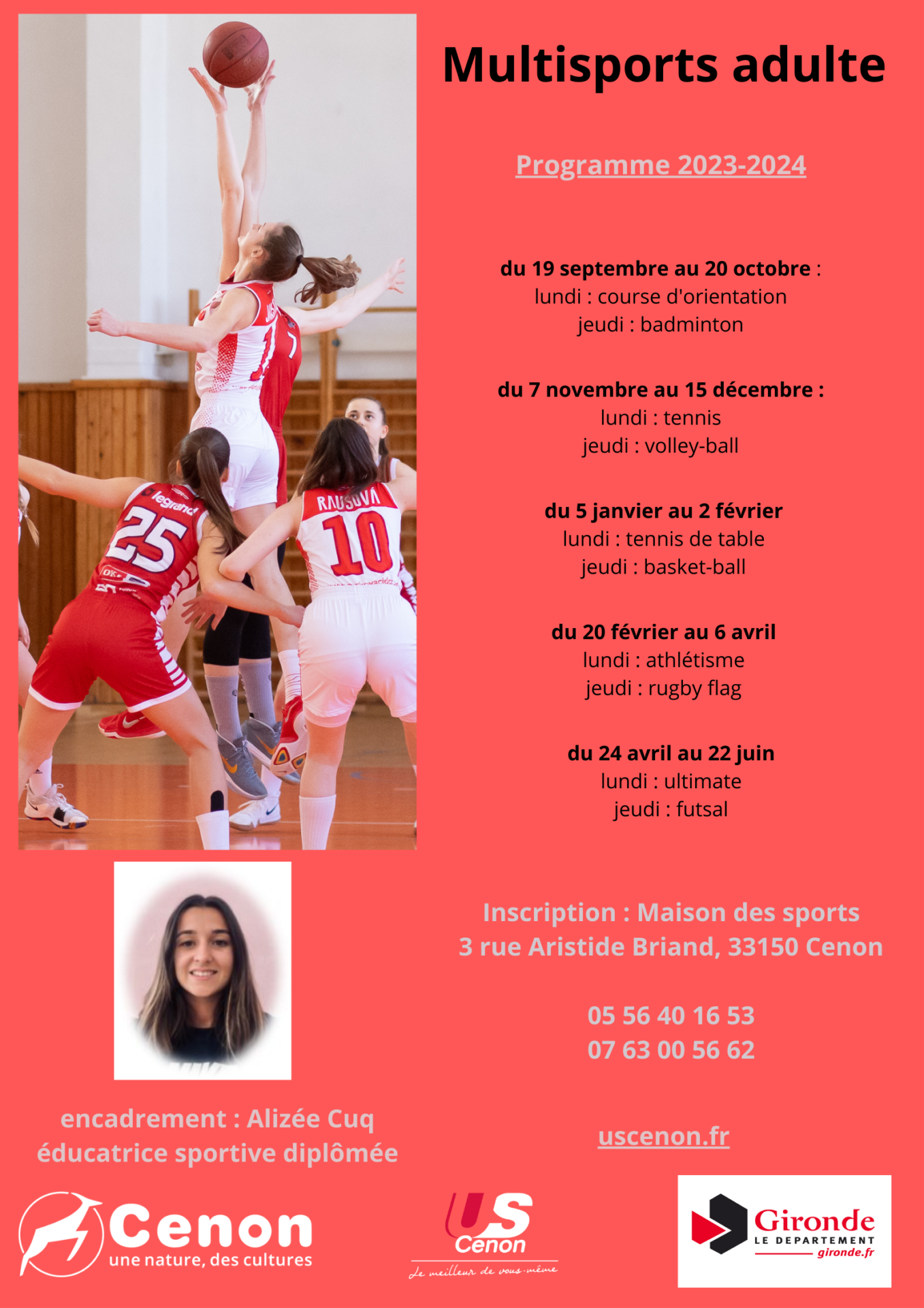 Le fonctionnement est simple : 6 cycles distincts se succèdent dans lesquels deux sports sont pratiqués et encadrés par notre éducatrice diplômée, qui vous accueillera le lundi et le jeudi soir. Comme tous les ans, deux séances d’essai gratuites sont prévues. Vous pouvez donc d’ores et déjà vous rapprocher du secrétariat de la maison des sports au 05 56 40 16 53 ou auprès d’Alizée, notre éducatrice au 07 63 00 56 62 ou encore vous rendre sur la page multisports du club. On vous attend nombreux !