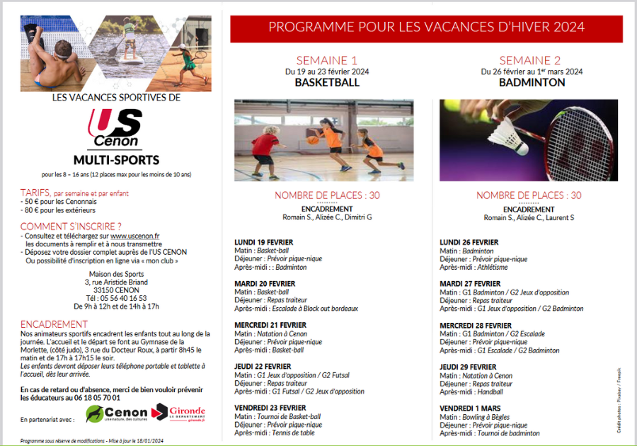 Comme chaque année, l’US Cenon organise en février deux sessions de vacances sportives hivernales. Axées principalement sur les sports de salle, ces deux semaines permettront également aux jeunes inscrits d’aller à la piscine Elodie Lorandi de Cenon, au bowling et au complexe d’escalade de Bordeaux lac.